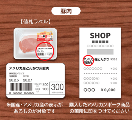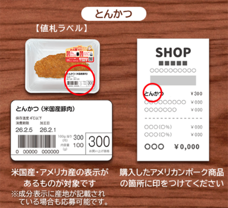 スーパー、ネット等でアメリカンポーク(米国産豚肉)を使用した惣菜とんかつ、または米国産のとんかつ用豚肉を購入し、値札ラベルとレシートを手元に準備する。